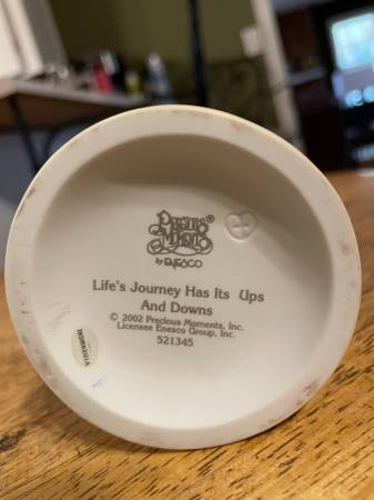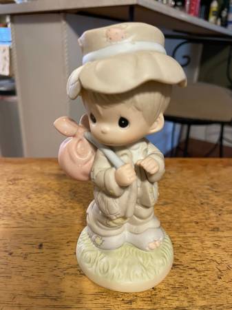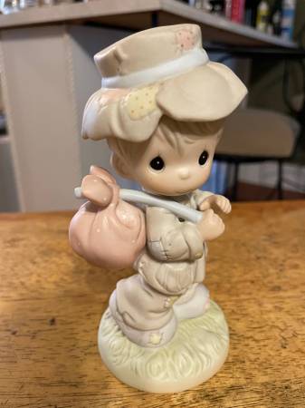 Decorative boy figure carrying bag over his shoulder, crafted with a whimsical hobo theme. Bisque porcelain. Copyright 2002 and retired in 2004. Licensee: Enesco Group, Inc.