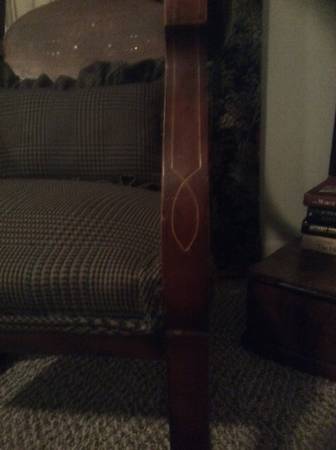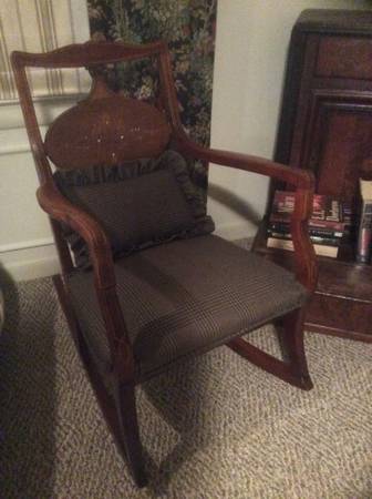 Antique rocking chair with beautiful detail on back with inlay of mother of pearl. Seat cushion is currently upholstered in designer Kravet wool plaid fabric. Very nice condition with normal wear...