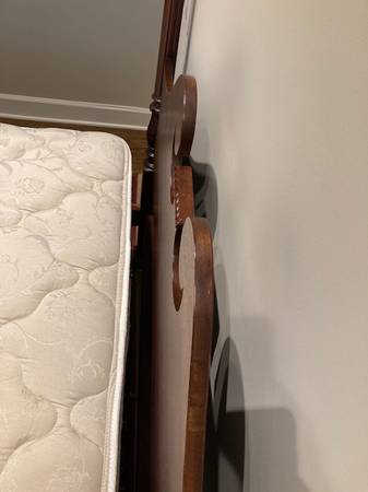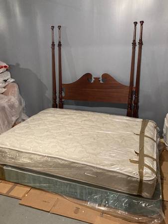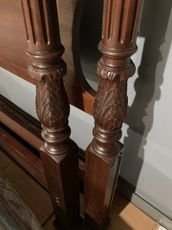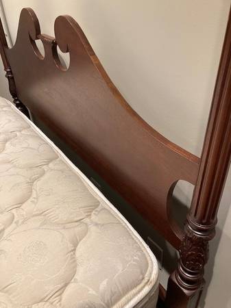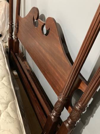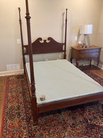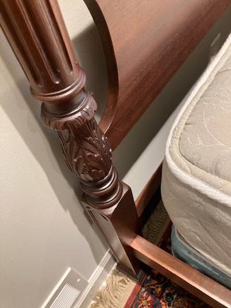 Original Family Ownership – Vintage, Handmade, Mahogany, 4 Poster, Full/Double Bed by Charak Furniture Company (Boston, MA), Piece # 676 (1941), new Serta mattress, custom-made box spring and metal bed frame.