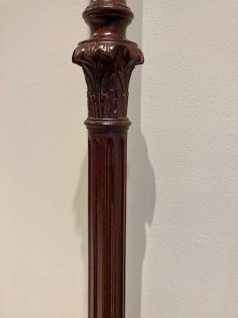 CONDITION: EXCELLENT. The Charak bed has been completely refinished to match its original, dark brown finish (see photographs). The attractive hand carved, solid mahogany reeded posts, solid square legs and finials accentuate the beautiful, traditional and timeless construction of the bed. Purchased in 1944 from A.H. Stiehl Furniture Company, NYC.