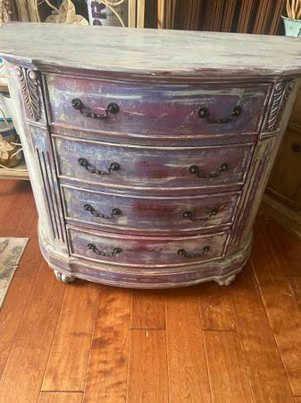 One-of-a-kind vintage dresser, hand-painted by **SeamsLikeSunflowers** in rich shades of purple, red, and white with a beautifully distressed finish. This piece features four drawers with ornate black metal handles and carved decorative side details. The curved front and rounded feet add charm and character.