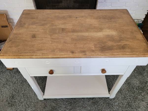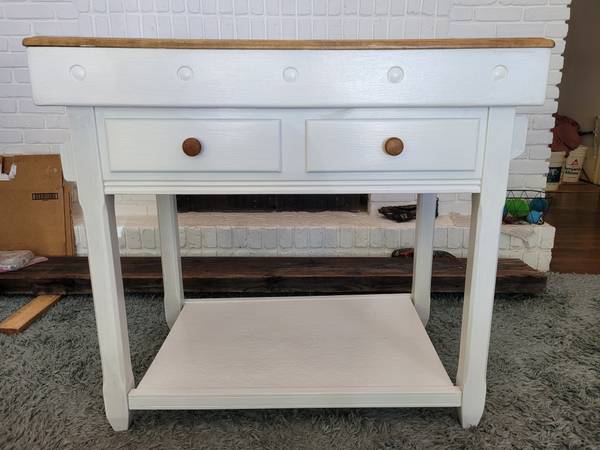 Farmhouse Kitchen Island Work Table w/ drawers, towel rack, spice rack, bottom shelf. VERY HEAVY SOLID WOOD! $150.00 Cash ONLY. Meet Locally. Leave a number or no response.