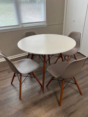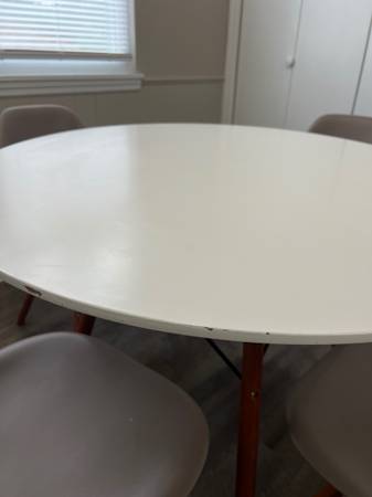 This table has been used daily so there are signs of wear. A couple of scratches and marks on the top and some cracks on the side, but overall a very sturdy table. Chairs are in great condition.