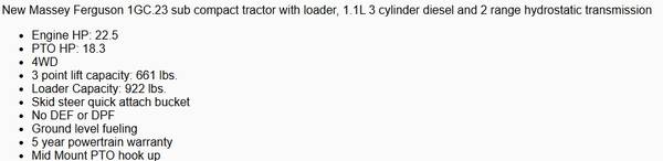 Massey Ferguson GC-1723 subcompact tractor for sale. Bought new 2 years ago and currently have 75 hours on it. Fresh oil change and all filters changed. Complete with bucket and the following extras: